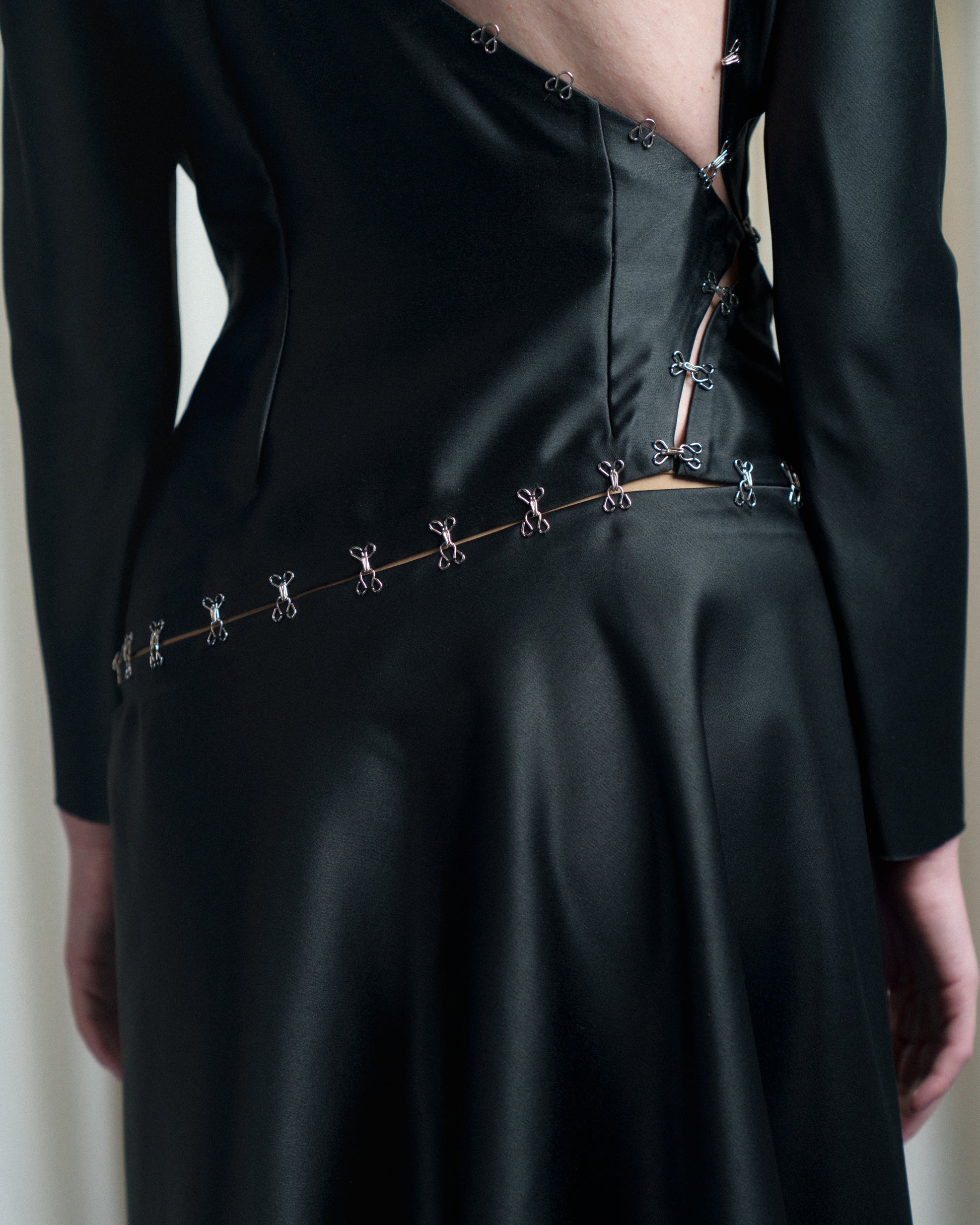 A black satin midi dress with long sleeves and a fluid silhouette. The design reveals an open asymmetric back and side cut-outs, connected by delicate hook-and-eye closures.