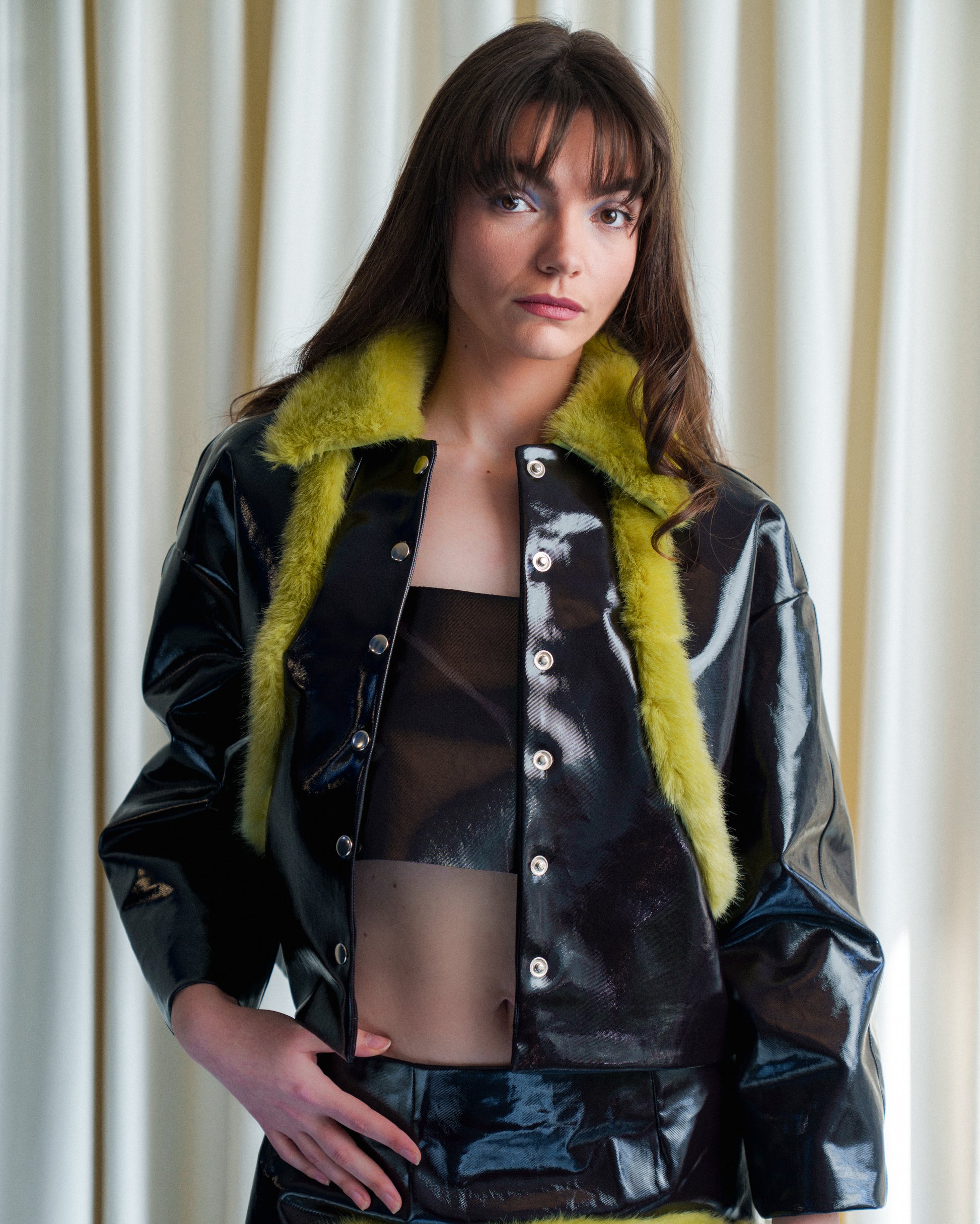 Two-piece set crafted from glossy Laminated Denim, defined by sculptural lines and contrasting fur trims. The cropped jacket and fitted skirt create a sharp silhouette, balancing texture, shine, and precise tailoring.
